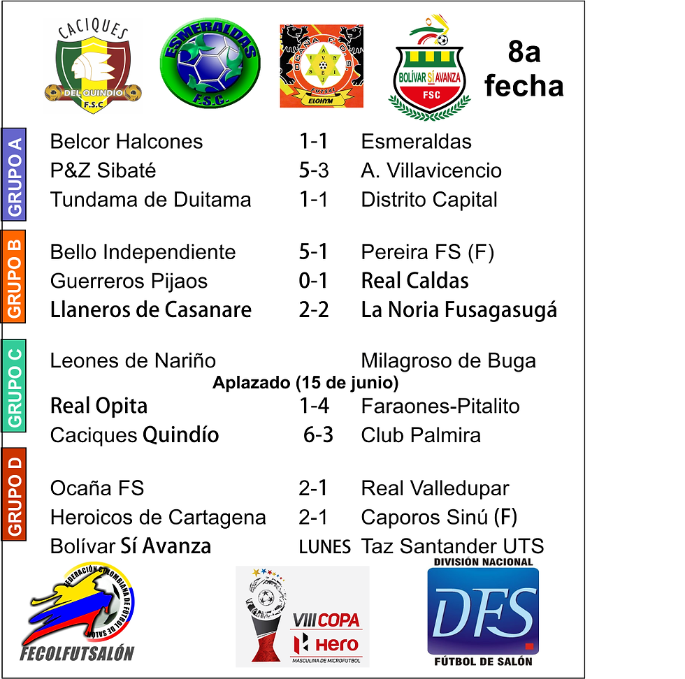 Los partidos Bello vs. Pereira y Heroicos vs. Caporos ya terminaron. El encuentro entre Leones de Nariño vs. Buga se jugará el 15 por problemas de orden público; y el lunes se disputará el partido entre Bolívar Sí Avanza vs. Taz Santander.