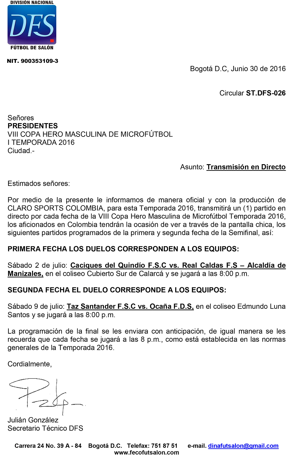 Comunicado de prensa informando la programación de los partidos que se televisarán en vivo y en directo por el canal Claro Sports para la primera y segunda fecha - Semifinal de la VIII Copa Hero Masculina de Microfútbol 2016.
