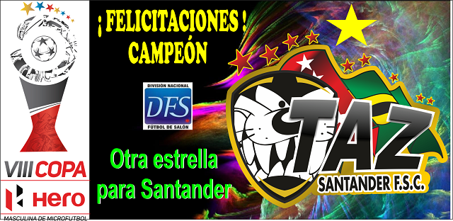 MANIZALES.- Taz Santander se convirtió en el primer campeón de la temporada de la VIII Copa Hero al vencer nuevamente en el partido de vuelta en Manizales a su similar de Real Caldas 5-3. Un partidazo para una digna final donde los jugadores de experiencia del equipo santandereano sacaron a relucir su jerarquía para administrar los tiempos y para alimentar a Felipe Echavarría quien se encargaría de convertir cuatro de las cinco anotaciones. Pese a la reacción de Caldas y los dos goles de Serna, a los locales no les alcanzó para intimidar a los campeones.