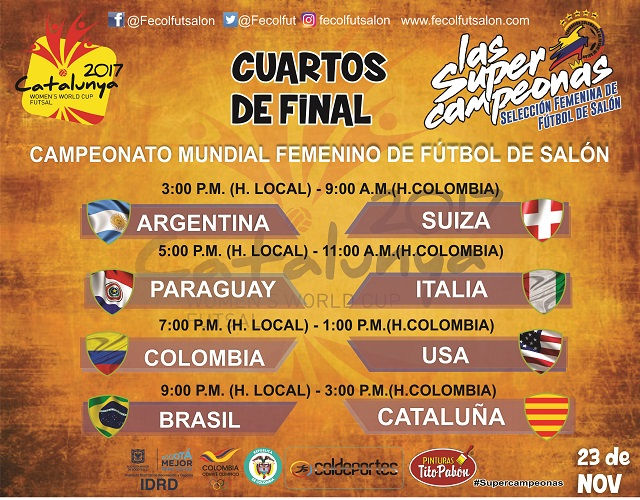 Estados Unidos, el rival de Las Supercampeonas este jueves, fue la última clasificada al vencer a Australia 6-2. Así las cosas, a partir de las 9:00 a.m., hora en nuestro país, Brasil dirimirá los cuartos de final con Cataluña; a las 11:00 a.m., Argentina se medirá con Suiza; a la 1:00 p.m., Colombia chocará con Estados Unidos y a las 3:00 p.m., Paraguay tendrá como rival a Italia.